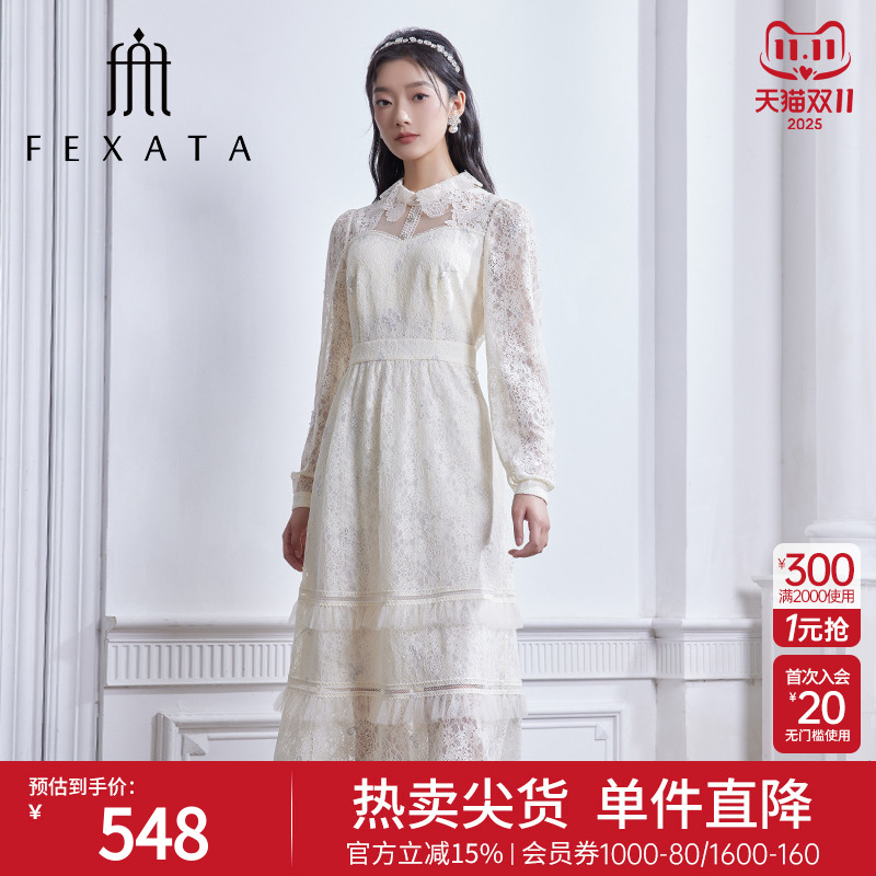 FEXATA斐格思2025春季新品长袖收腰浪漫千金感长款蕾丝裙连衣裙
