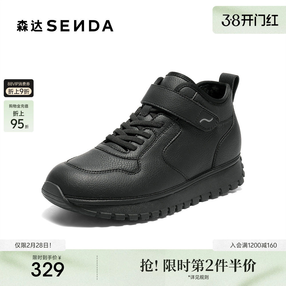 森达加绒高帮鞋女2025冬季新款女鞋厚底运动鞋白色休闲板鞋XUA01