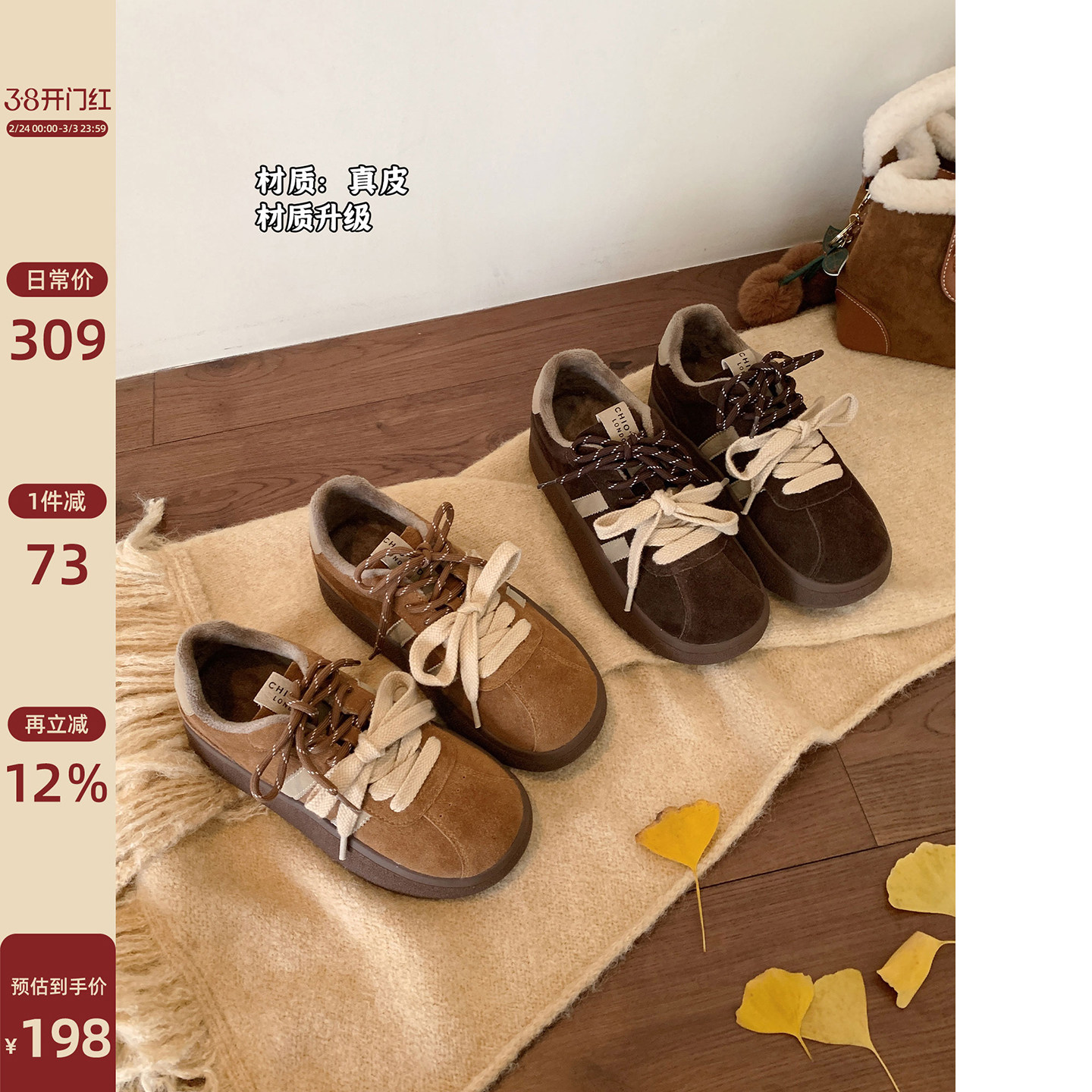 歌诗茵老爹鞋女加绒2026秋冬新款真皮厚底女鞋复古百搭休闲运动鞋