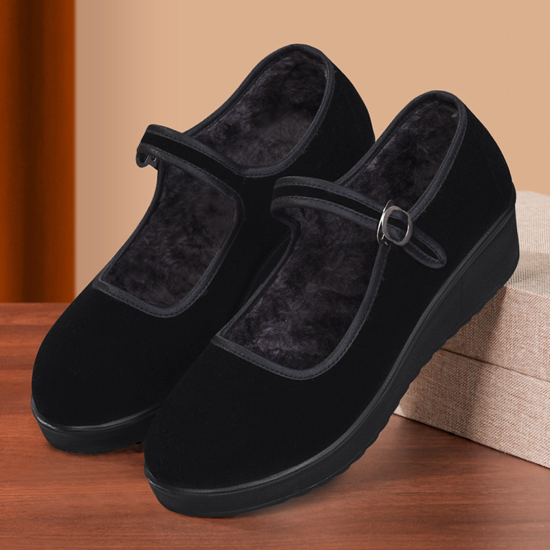 秋冬老北京布鞋女鞋厚底加绒保暖妈妈棉鞋软底防滑厨房平底工作鞋