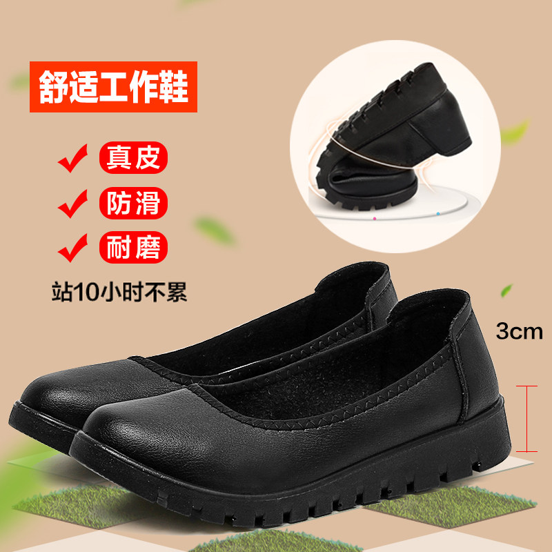 平底工作鞋女黑色厚底防滑酒店真皮圆头浅口职业女单皮鞋通勤妈妈