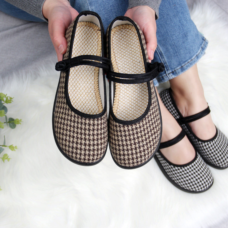 25年春款手工上线棉布女士格子布花鞋复古文艺浅口舞蹈平底工作鞋