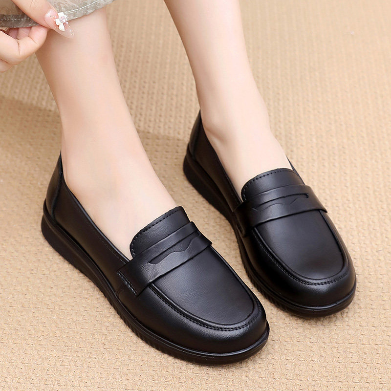 春秋妈妈鞋女皮鞋软头软底防滑中老年女单鞋平底工作鞋黑色豆豆鞋