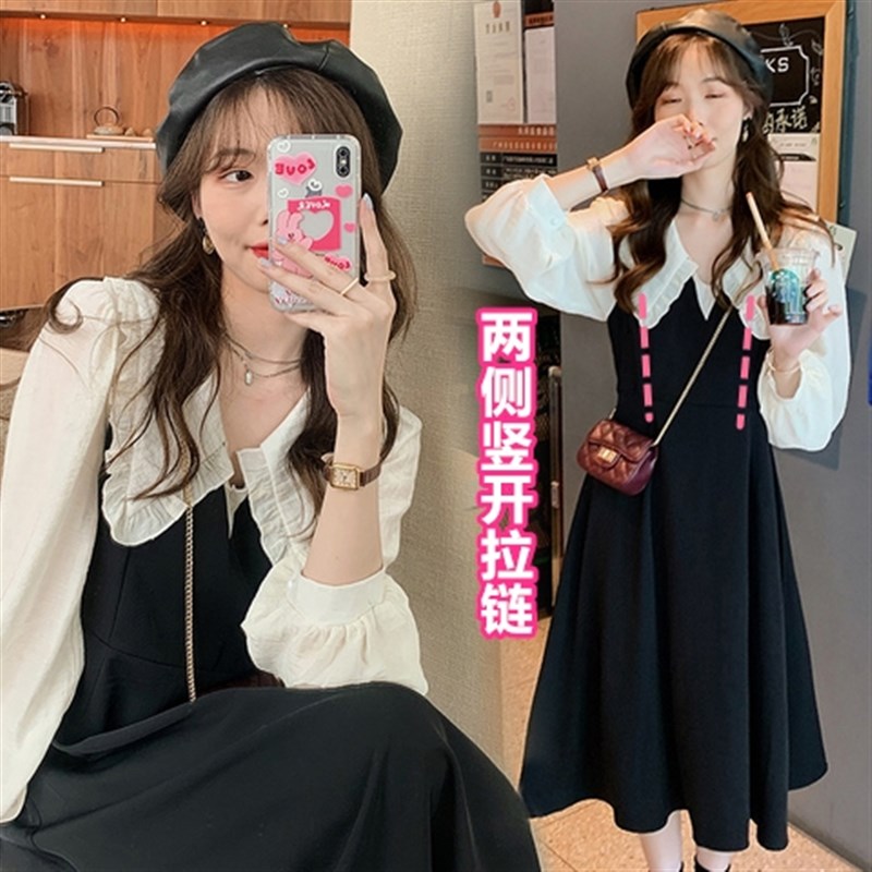 纯欲轻奢御姐风黑色长袖连衣裙女早秋季收腰翻领衬衫半身裙两件套