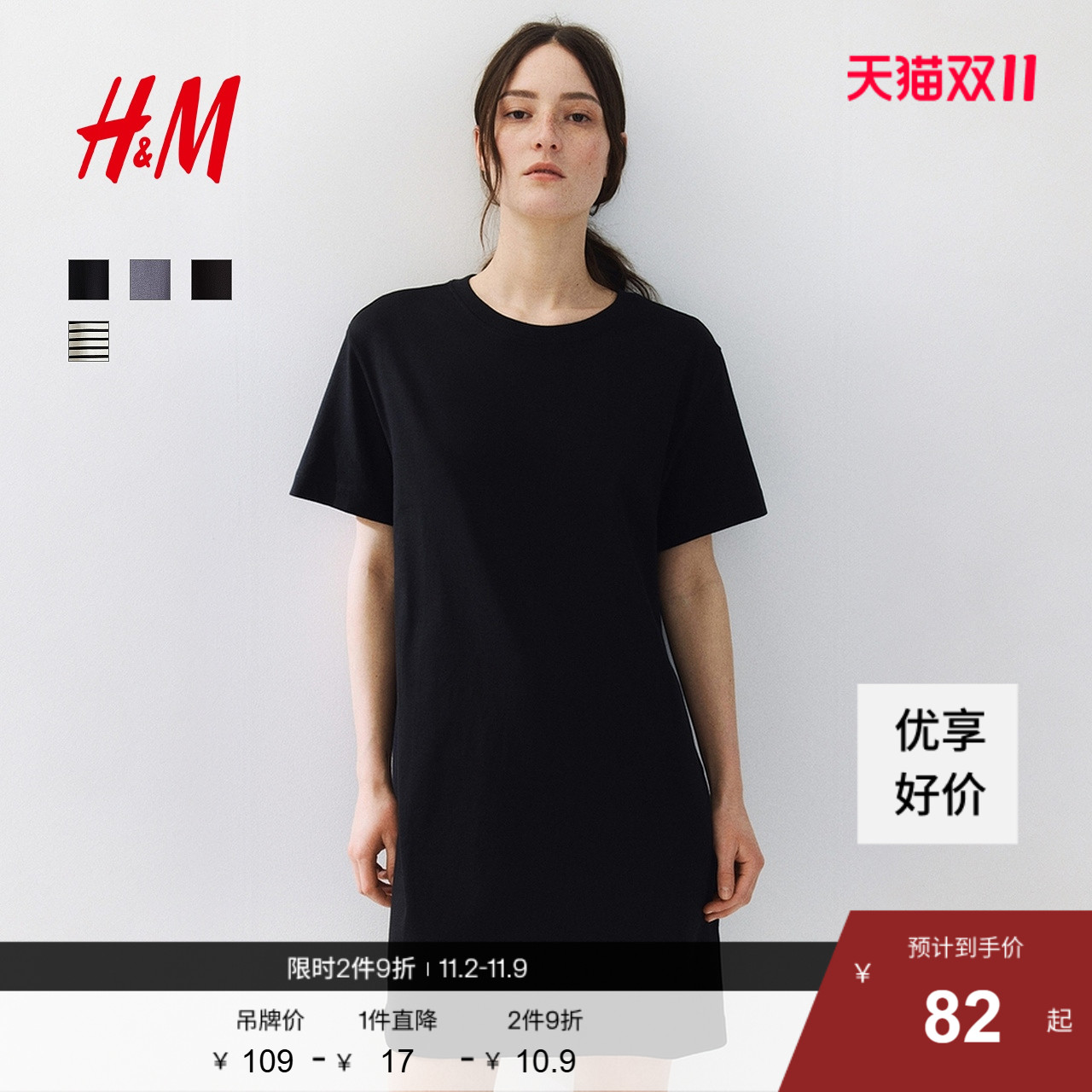 HM女装连衣裙秋季纯棉圆领短袖简约休闲舒适T恤式连身裙1278156