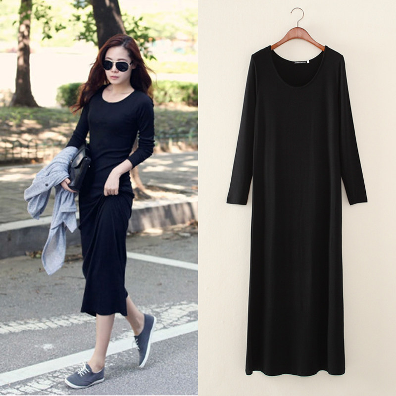 欧美风chic夏装莫代尔连衣裙显瘦打底裙长袖U领拖地长裙女装大码