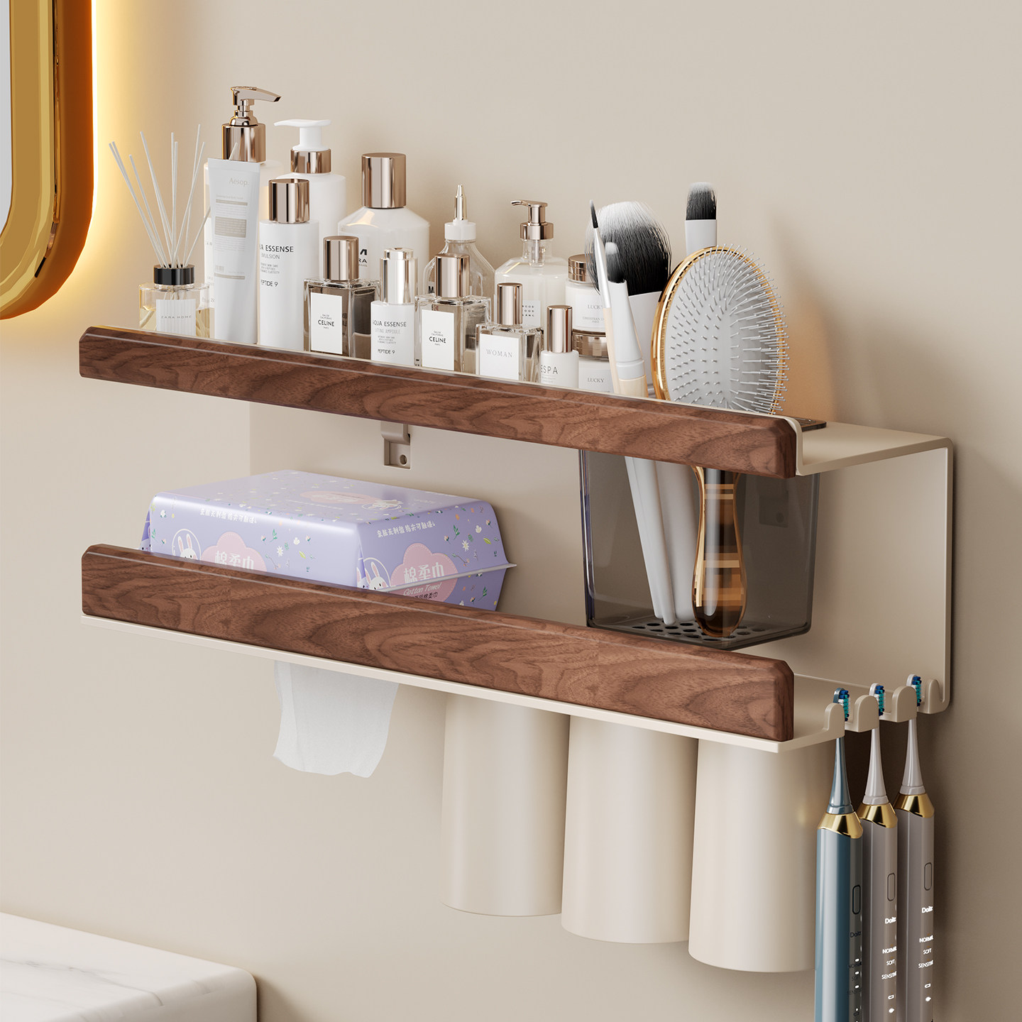 胡桃木多功能壁挂式牙刷架免打孔卫生间置物架多杯位牙具收纳神器