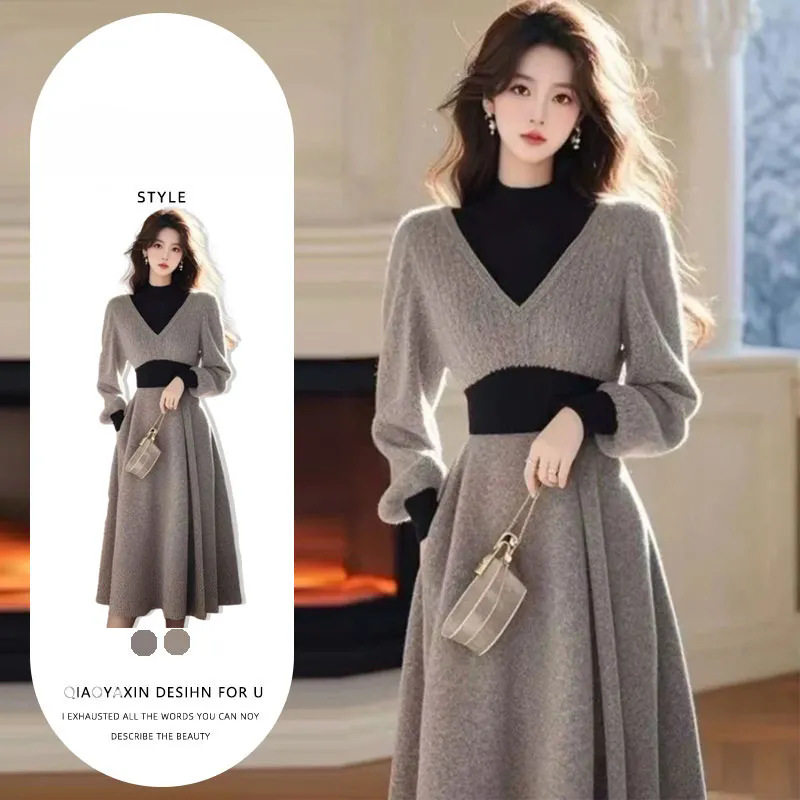 2026新款灰色高领针织毛衣连衣裙子女装秋冬季小个子2026套装长裙