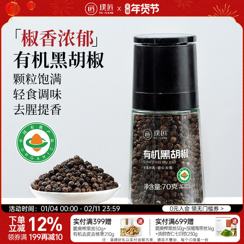 璞匠有机黑胡椒颗粒带研磨器家用现磨海盐胡椒粉轻食西餐牛排香料