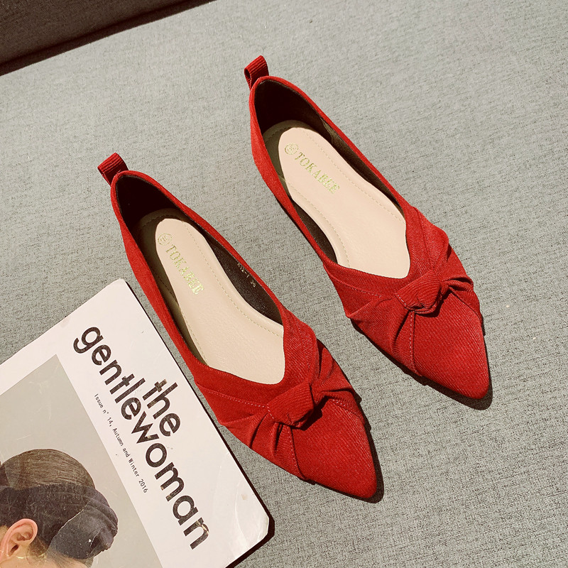 红色新娘鞋女单鞋韩版网红百搭仙女风尖头浅口平底鞋软底豆豆鞋41