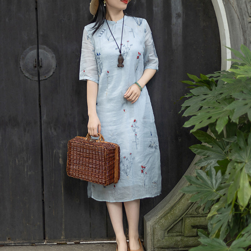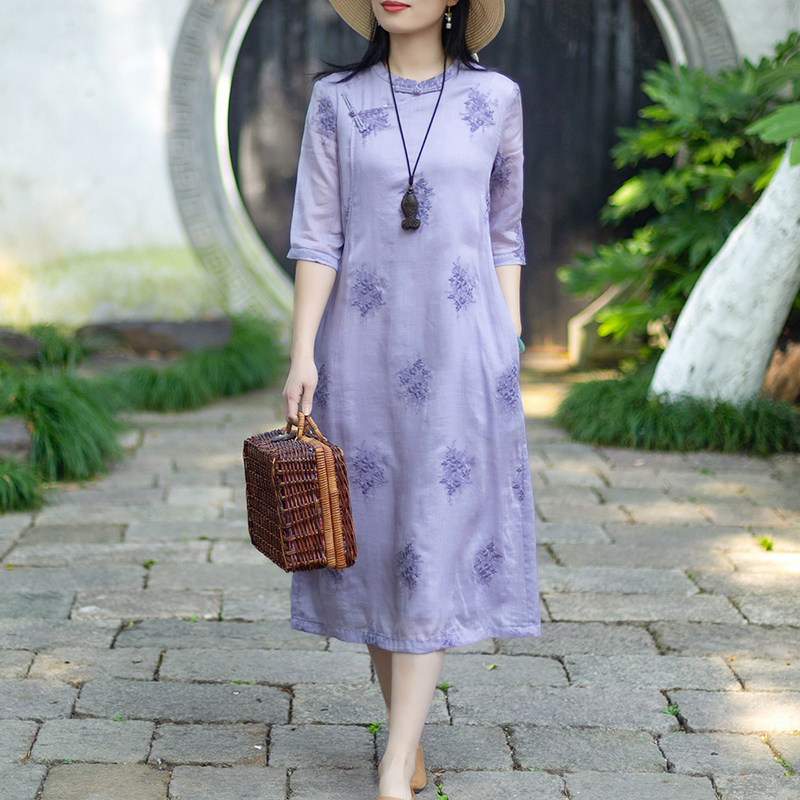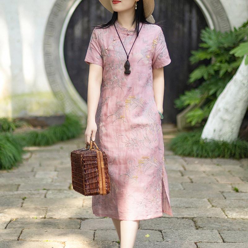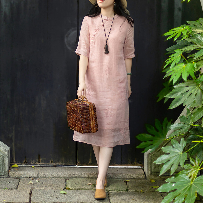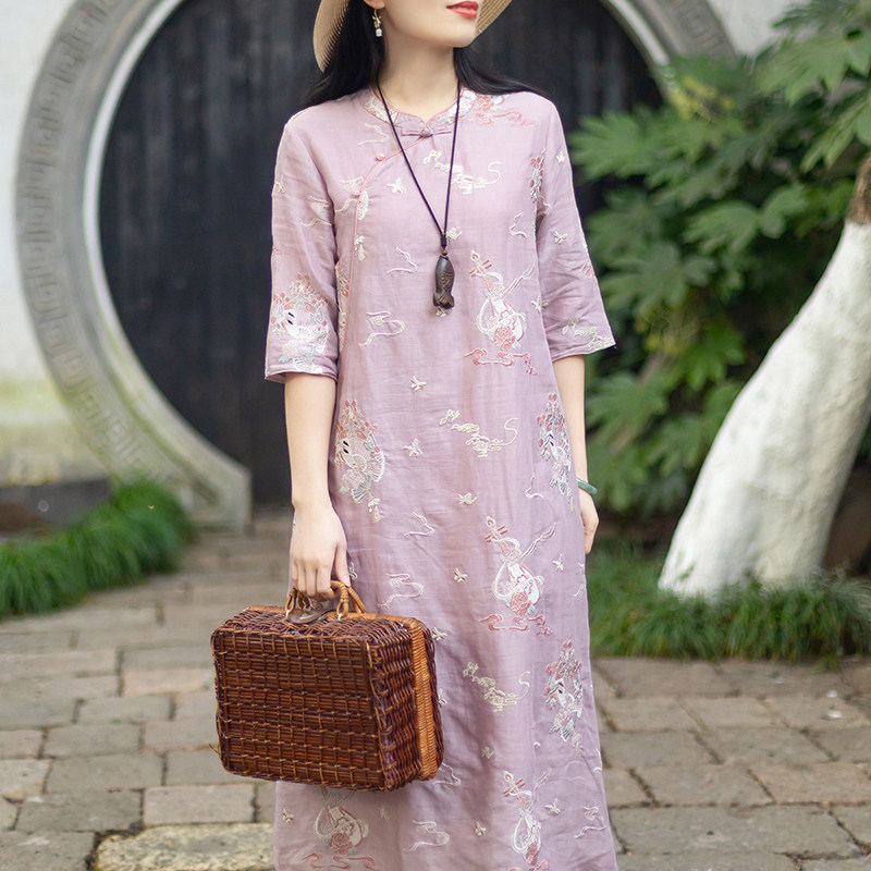 夏款新21支亚麻立领领旗袍式半开襟七分袖A字文艺长裙女连衣裙