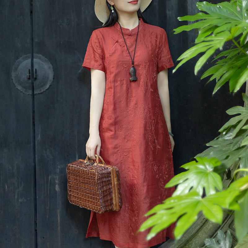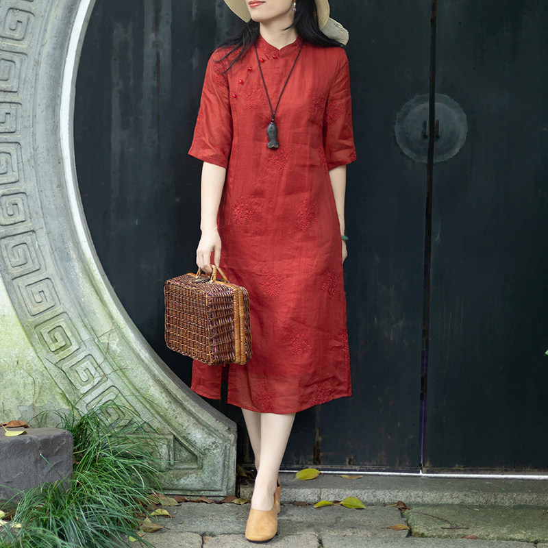 念江南复古氛围感红色重工刺绣苎麻改良旗袍裙女立领新中式连衣裙