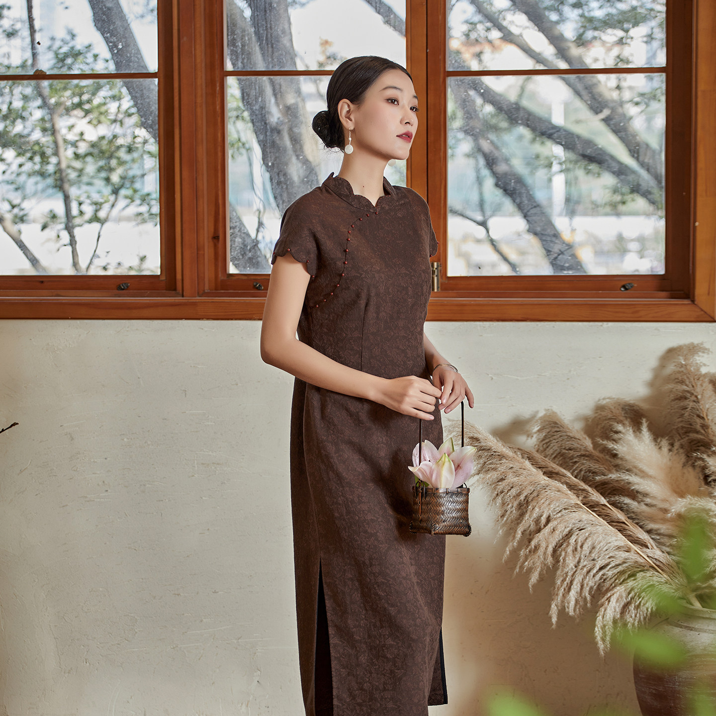 栖云 春季新款棉麻提花长袖无省旗袍新中式民国风斜襟盘扣连衣裙