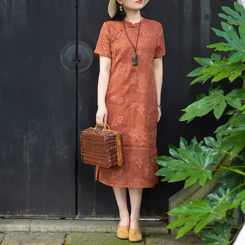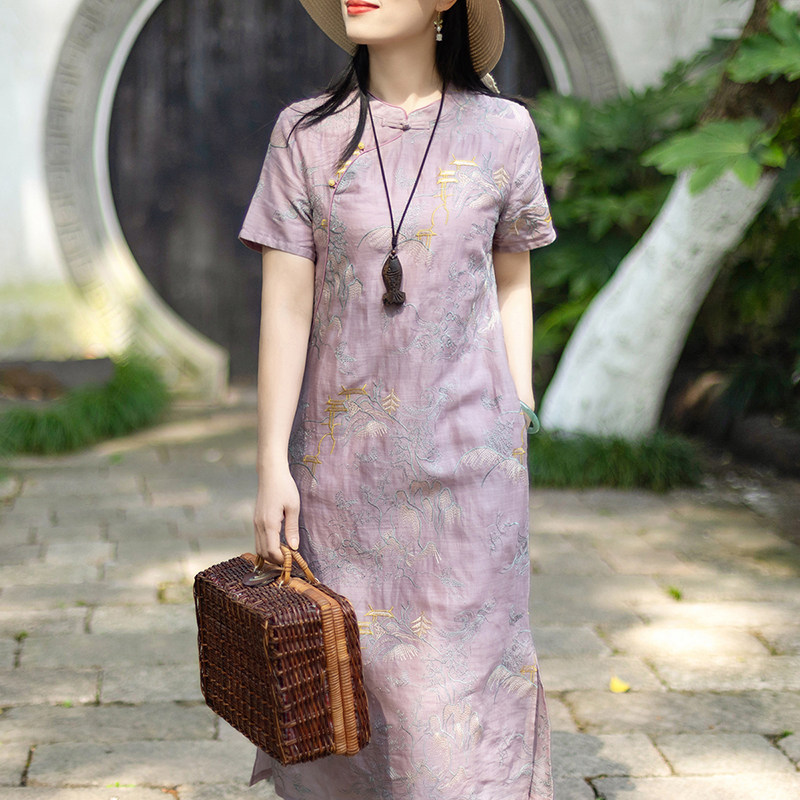 2025年夏季新款重工刺绣苎麻连衣裙复古文艺气质改良旗袍长款茶服