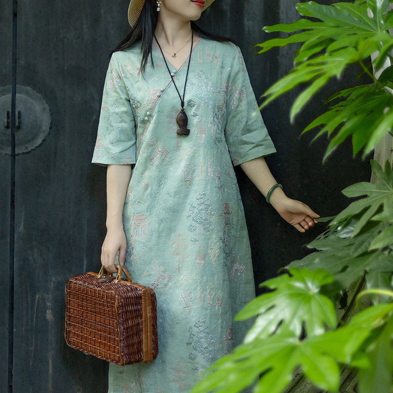 念江南重工气质V领苎麻刺绣小众设计连衣裙女新中式改良旗袍裙子