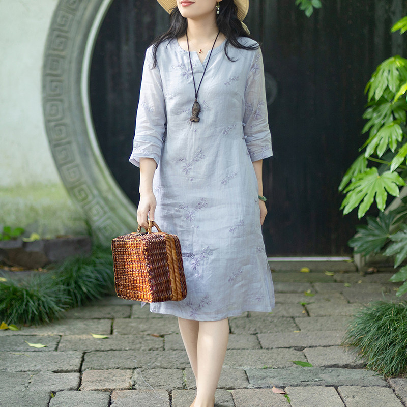 念江南轻氧复古风新中式禅意刺绣苎麻连衣裙女春夏文艺改良旗袍裙