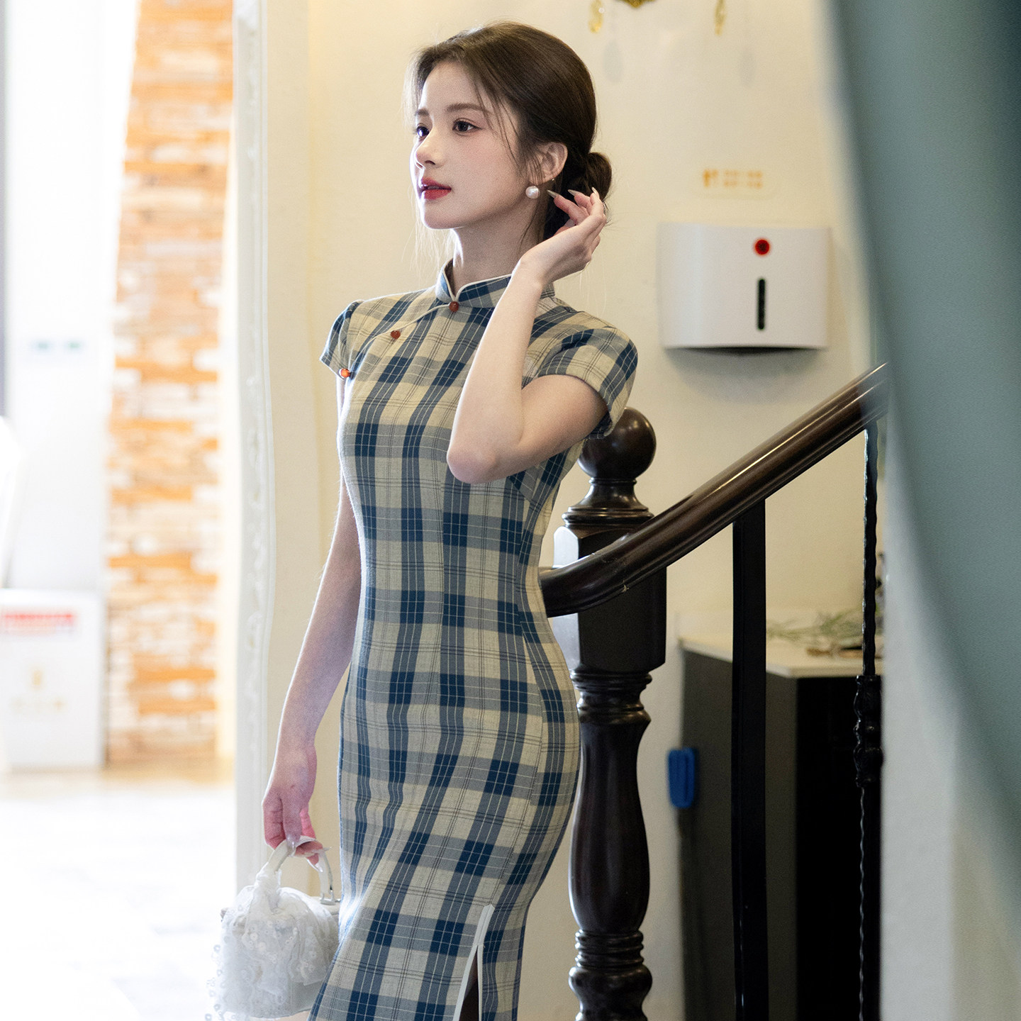 夏季新款格子旗袍女新中式民国风日常少女薄仿棉麻小个子学生文艺