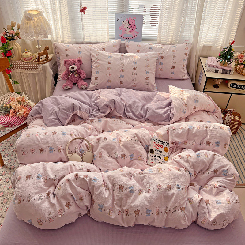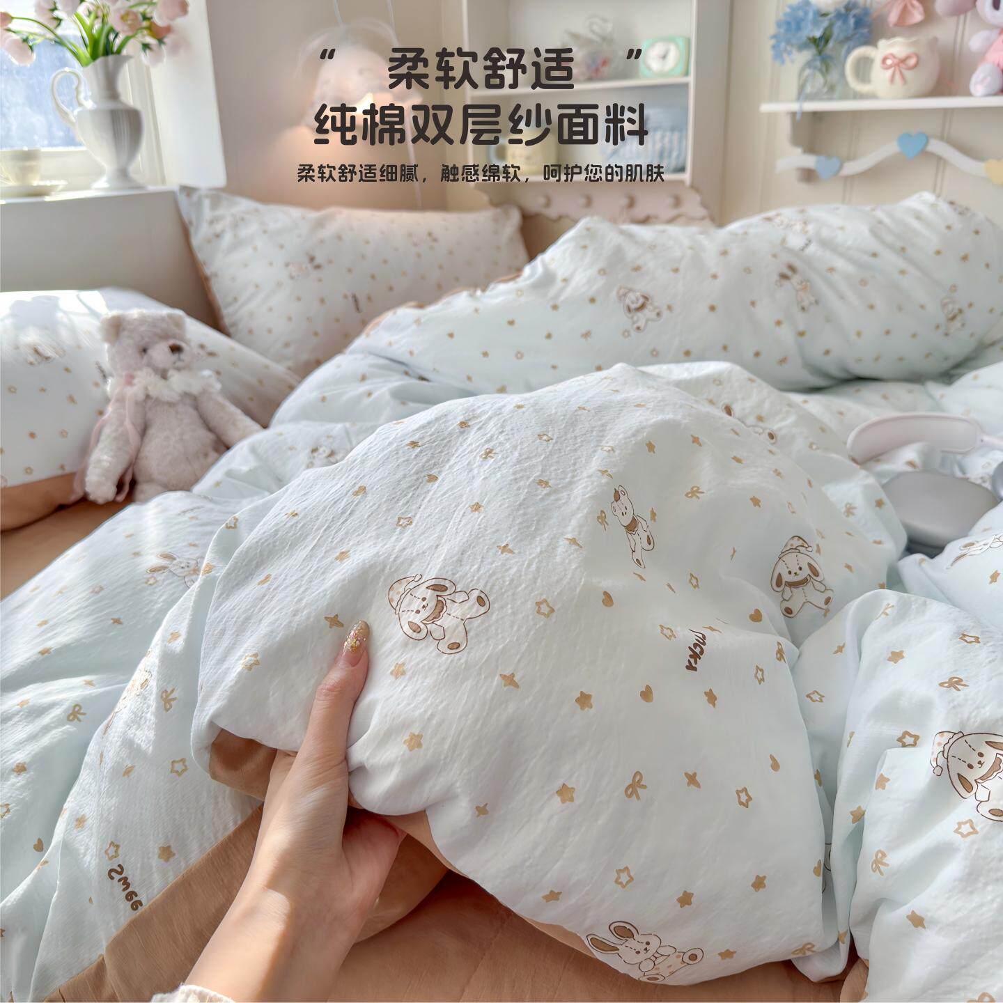 A类母婴双层纱床上四件套纯棉全棉田园床单件被套被罩宿舍三件套4