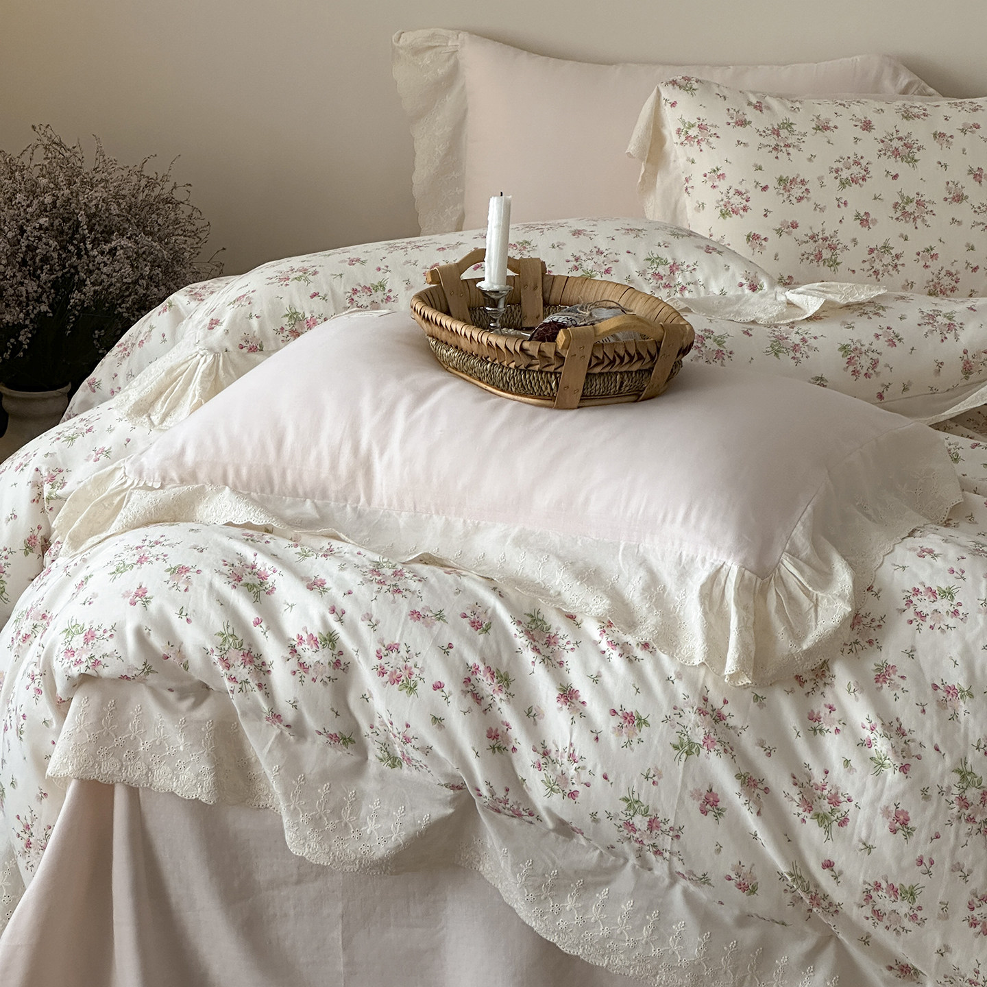 法式少女小碎花全棉皱皱纱四件套双层纱纯棉蕾丝花边被套田园床品