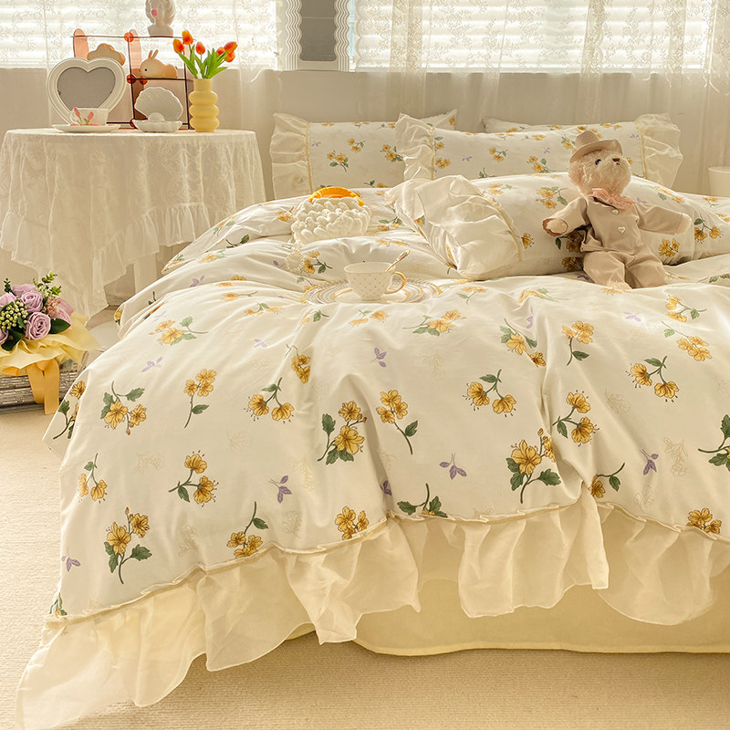 仙女款荷叶边纯棉四件套亲肤少女清新全棉被套碎花田园床裙款床品