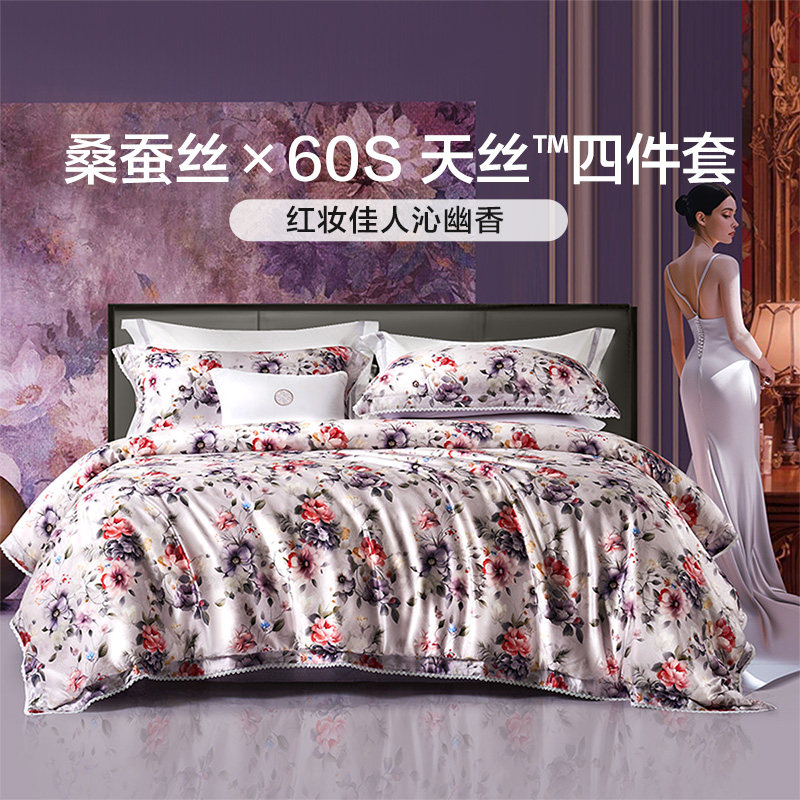 富安娜家纺桑蚕丝四件套印花床单天丝轻奢田园床上用品莱赛尔纤维