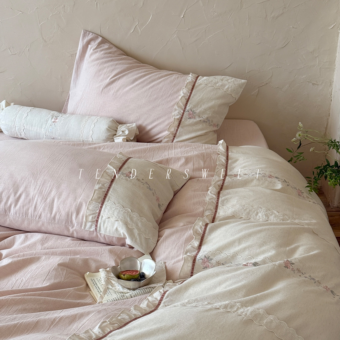 Tende|法式少女棉麻刺绣四件套蕾丝花边公主田园床单被套床上用品