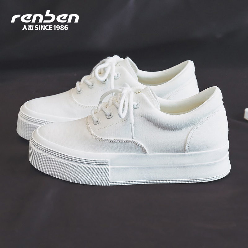 人本帆布鞋女内增高厚底小白鞋春秋款韩版学生百搭基础系带休闲鞋