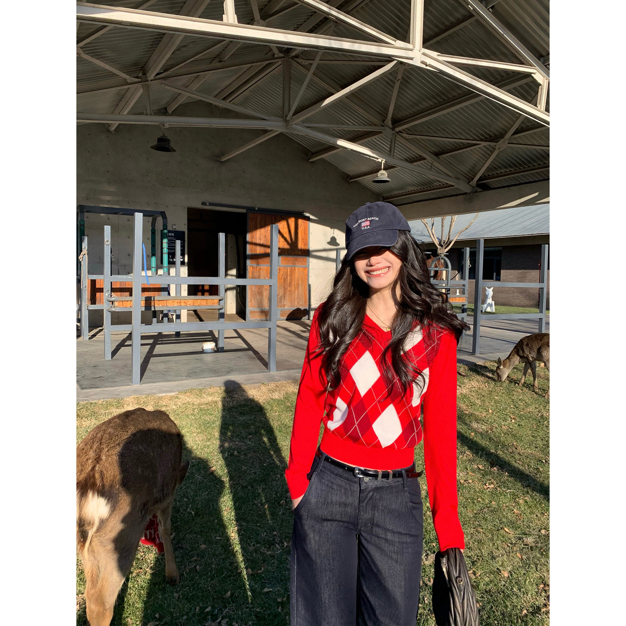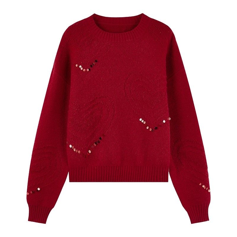DPLAY圣诞穿搭红色针织衫女装2025秋冬新款时尚宽松毛衣新年上衣