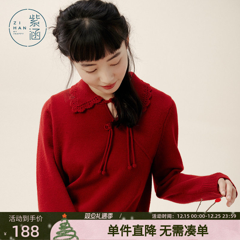 紫涵新中式翻领斜襟盘扣针织衫毛衣女冬季新款国风红色打底衫上衣