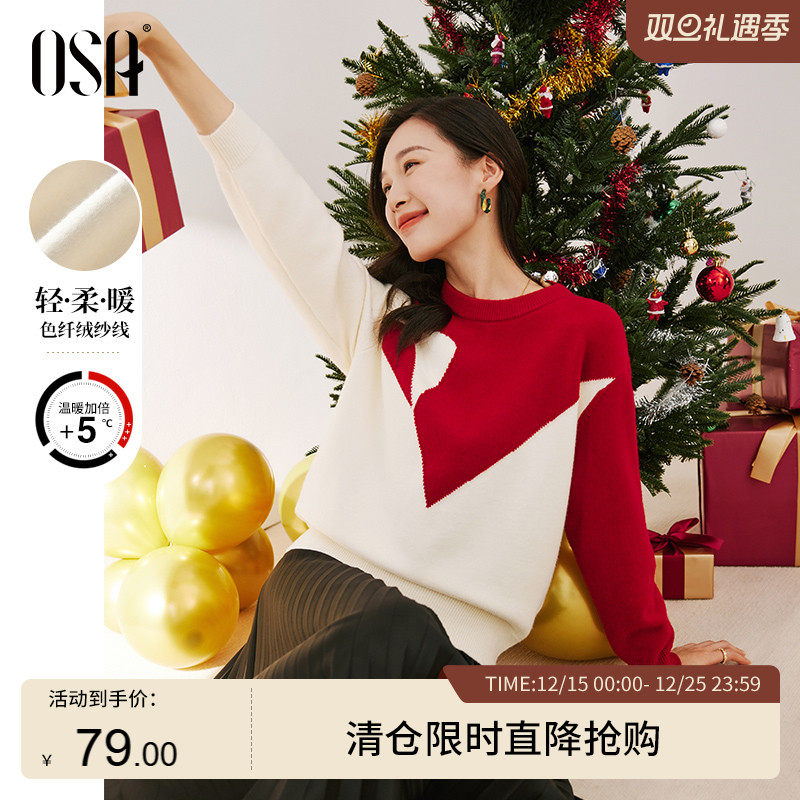 OSA欧莎慵懒风复古红色针织衫上衣套头毛衣女士秋冬季2024年新款