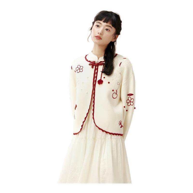 紫涵红色盘扣针织开衫女冬季新款新中式手钩花刺绣灯笼袖毛衣外套