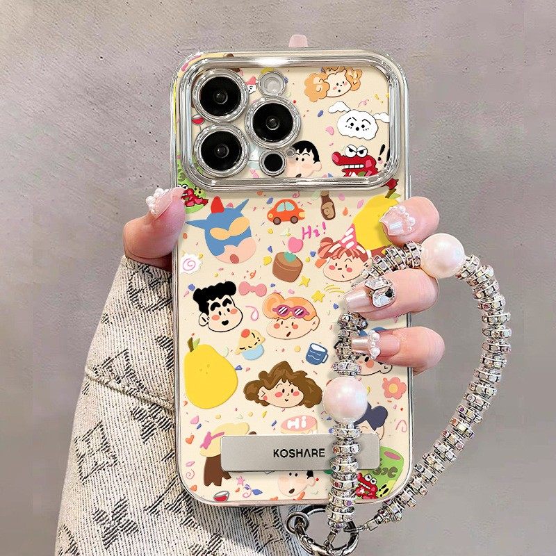 适用苹果15手机壳iPhone14pro可爱小新家族支架链条13电镀6D视窗x