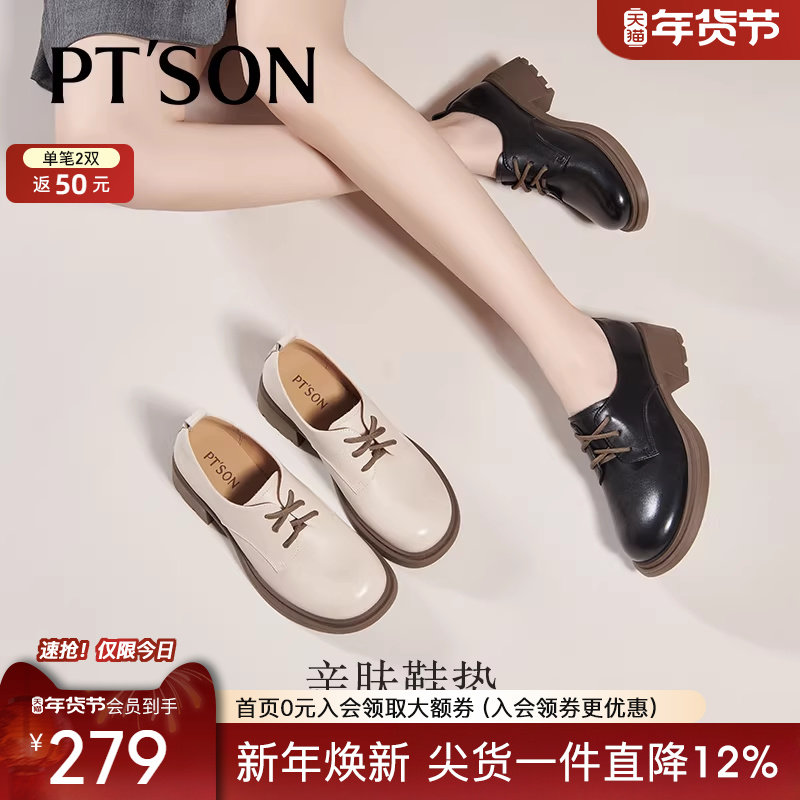 百田森白色乐福鞋女秋冬英伦风系带小皮鞋真皮小个子粗跟深口单鞋