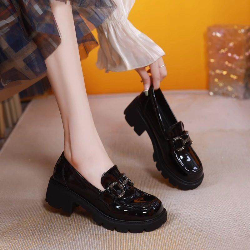 香港松糕厚底小皮鞋女2025新款百搭金属扣乐福鞋真皮深口粗跟单鞋