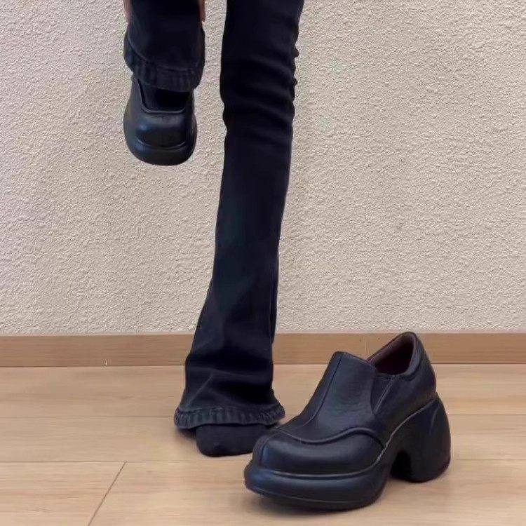 11cm黑色深口厚底单鞋女粗跟秋季款真皮一脚蹬防水台圆头高跟鞋女