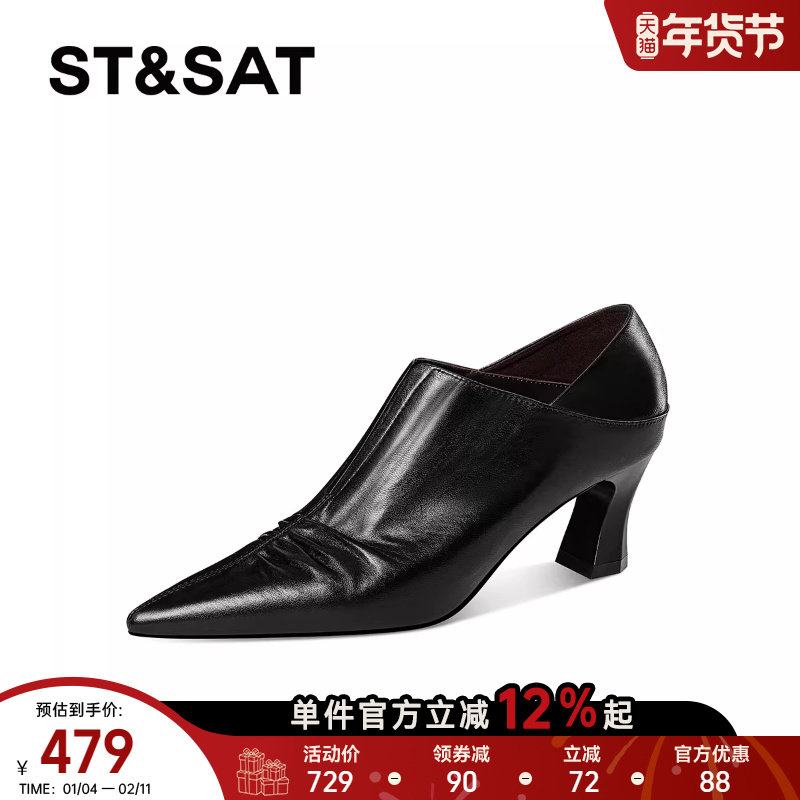 星期六真皮羊皮尖头中跟单鞋2025新款深口粗跟女款皮鞋女鞋子直