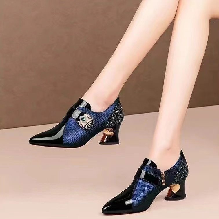 松紧口高跟鞋女尖头粗跟四季鞋春秋新款法式复古拼接真皮深口单鞋