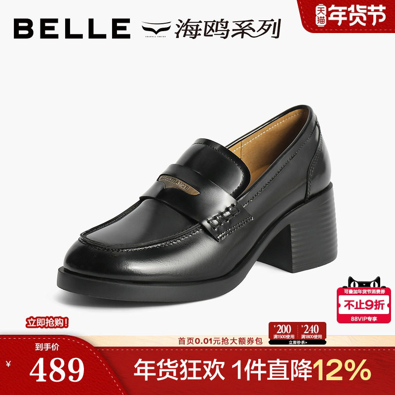 百丽女鞋子粗跟JK乐福鞋新款真皮黑色小皮鞋深口单鞋子B5K1DCA4
