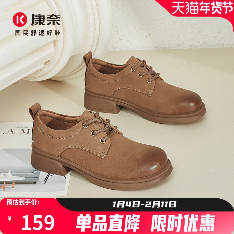 康莉真皮深口单鞋女秋冬季新款牛皮粗跟百搭英伦复古系带皮鞋女鞋