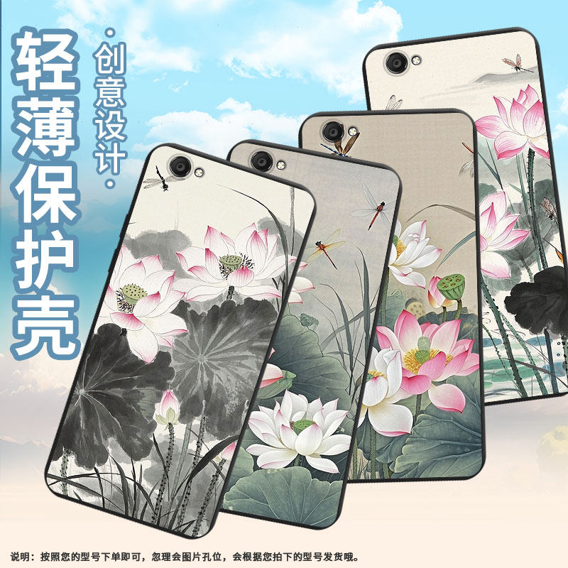 适用vivoY67手机壳全包边商务vivoV5Lite时尚磨砂壳vivoY66i男女款vivoZ1Pro水墨荷花超薄防摔潮流保护套