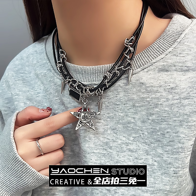 皮质铆钉星星项链女朋克y2k辣妹小众嘻哈亚文化锁骨链颈链毛衣链