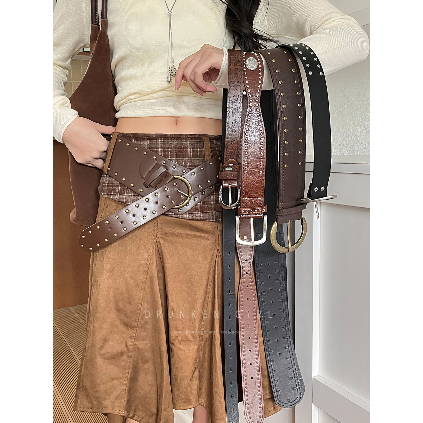 复古棕色铆钉卡扣皮带女款配牛仔裤高级感毛衣腰带装饰腰间配饰品