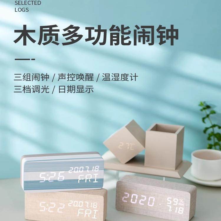 ins简约木质声控数字钟闹钟学生桌面时钟摆件led夜光电子钟木头钟