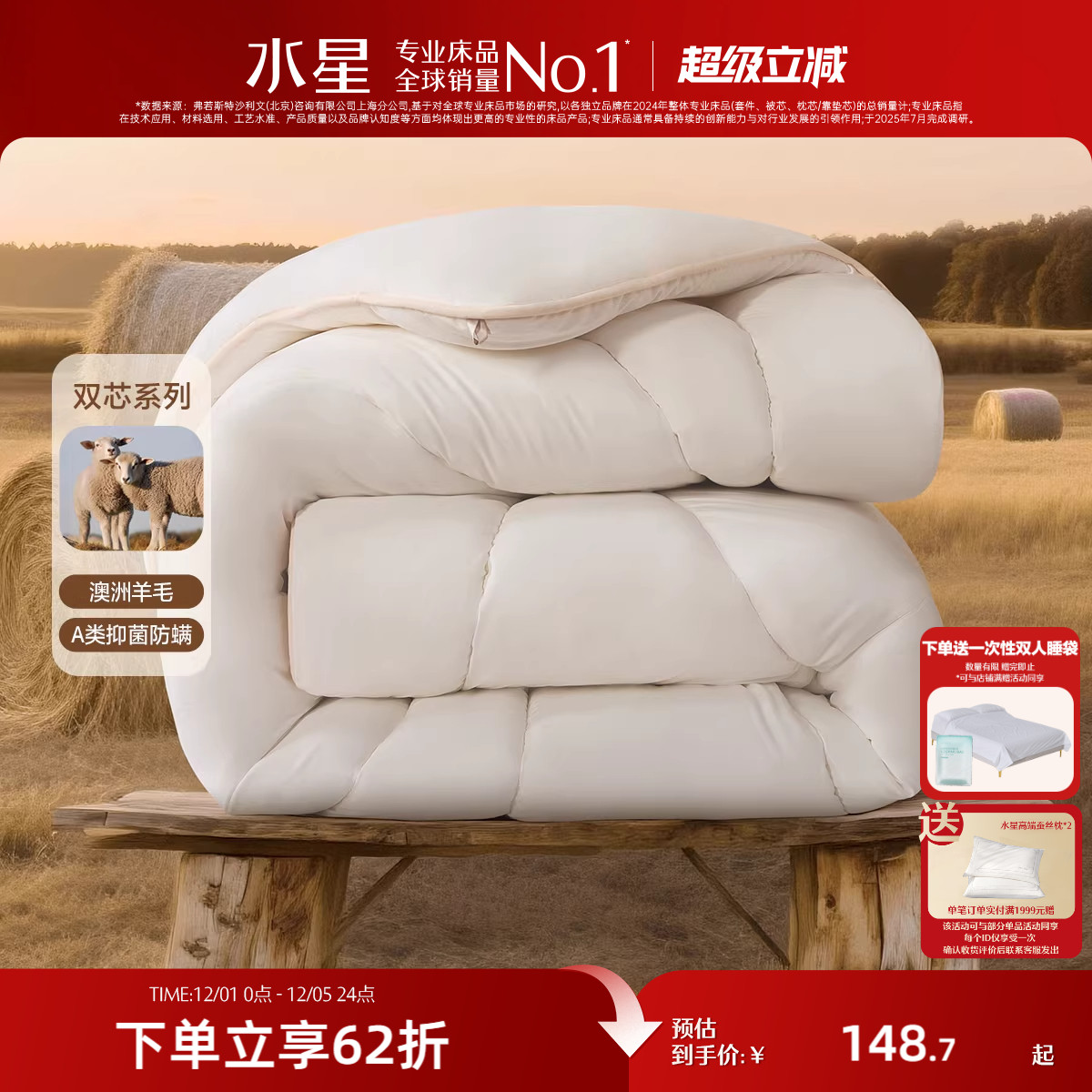 水星家纺澳洲羊毛被子抑菌羊毛四季被保暖冬被加厚冬被25新款床品