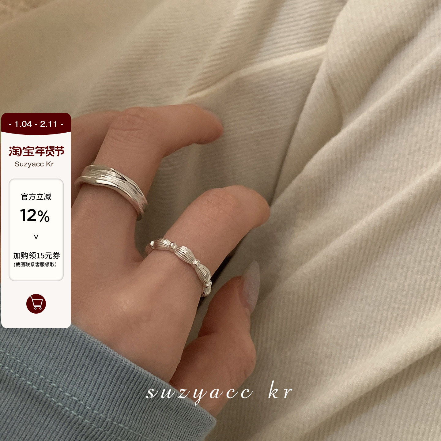suzyacc kr小众设计肌理感纯银戒指女简约轻奢高级感食指戒可调节
