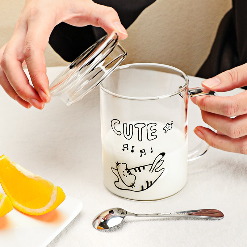 ins玻璃杯少女心家用带盖把手水杯微波加热牛奶杯可爱小新马克杯