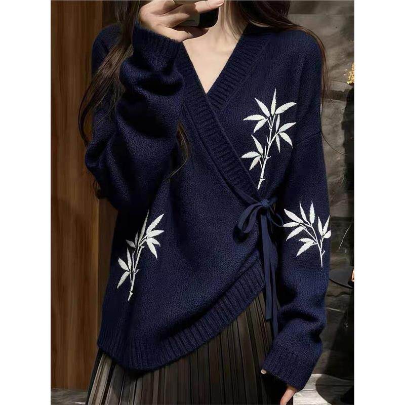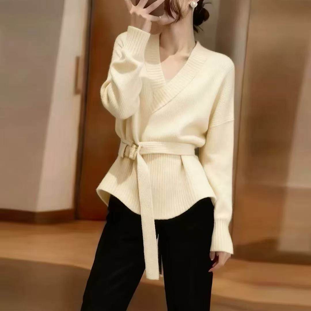 牛X货 巨炸裂!新中式国风V领系带毛衣女秋季慵懒风宽松针织上衣
