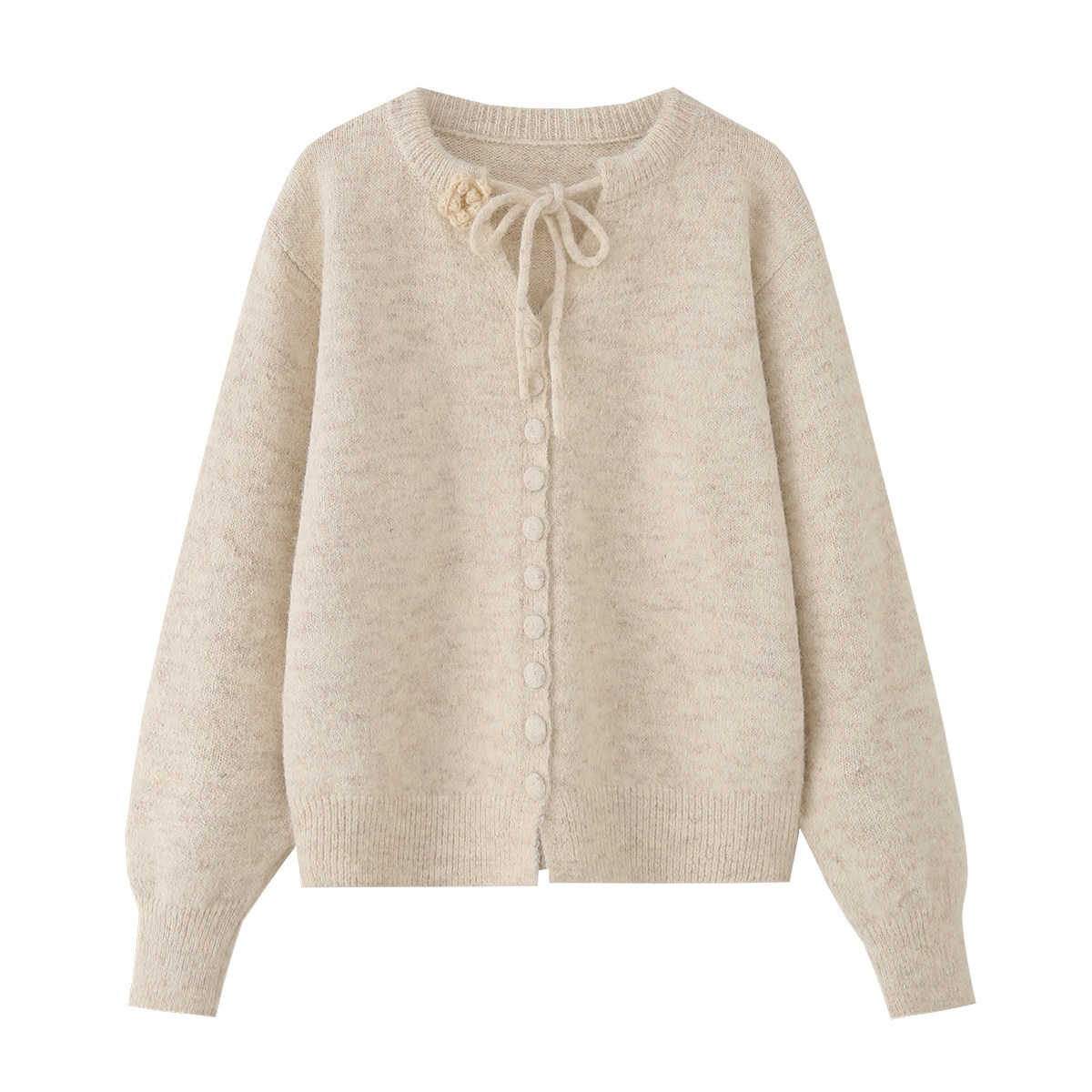 茵 甜美气质圆领单排扣针织开衫女花朵蝴蝶结系带毛衣女2025秋冬