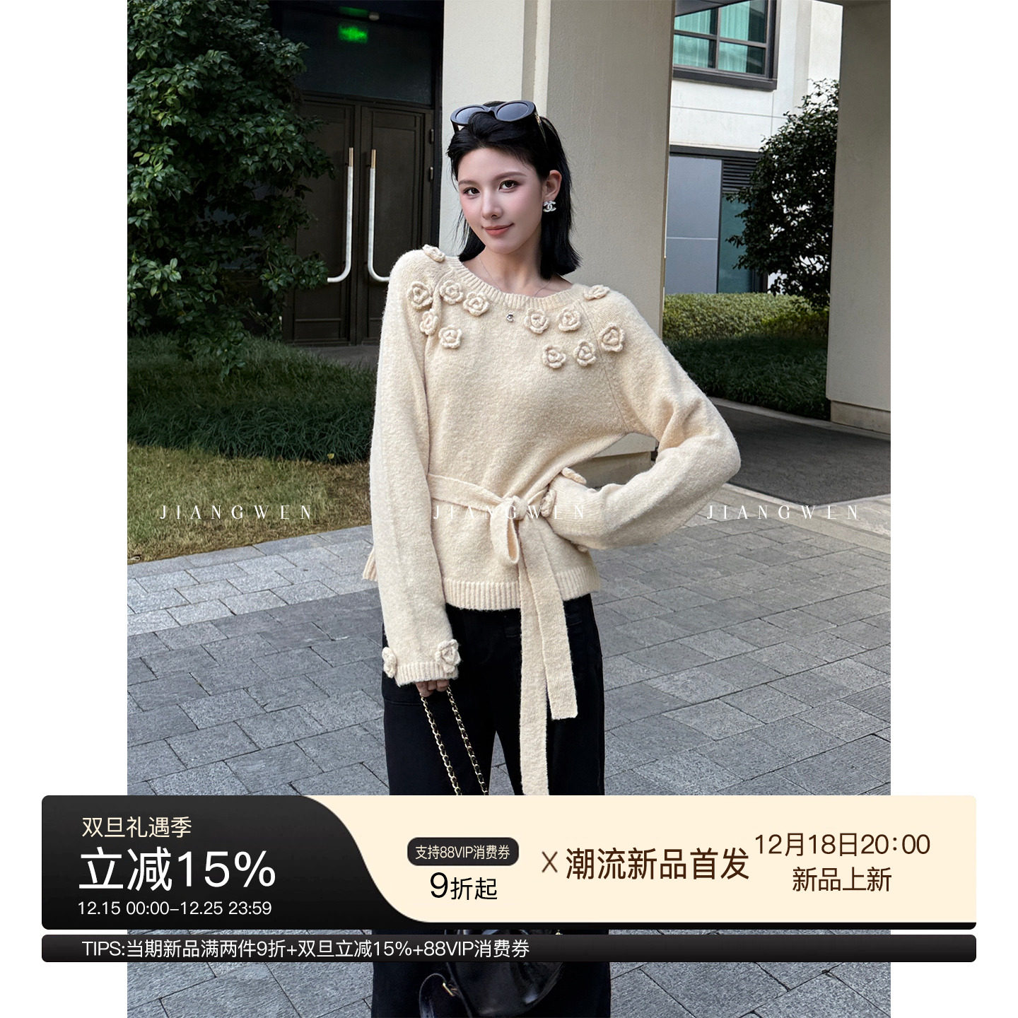 姜雯 慵懒风立体玫瑰系带毛衣女冬季纯色羊毛巨好看收腰针织套头