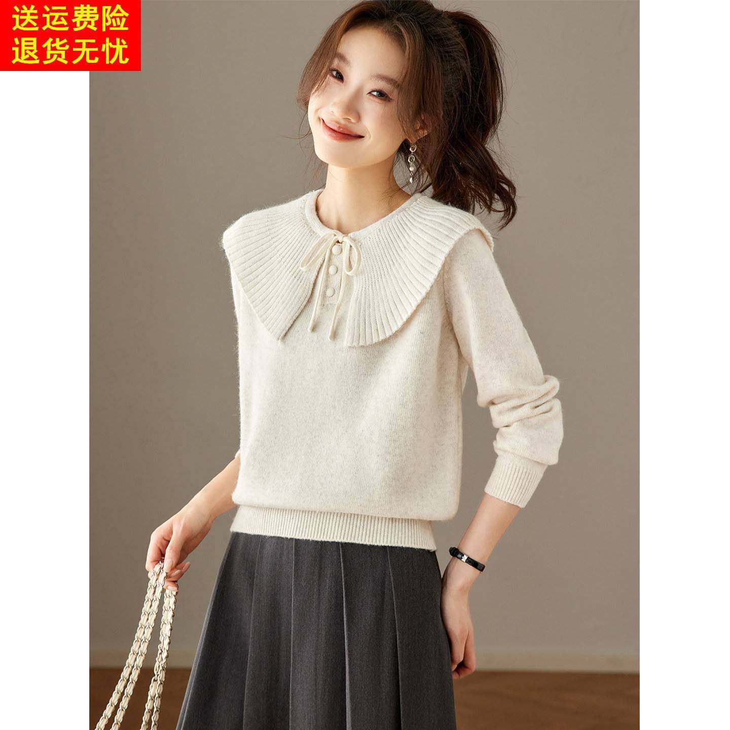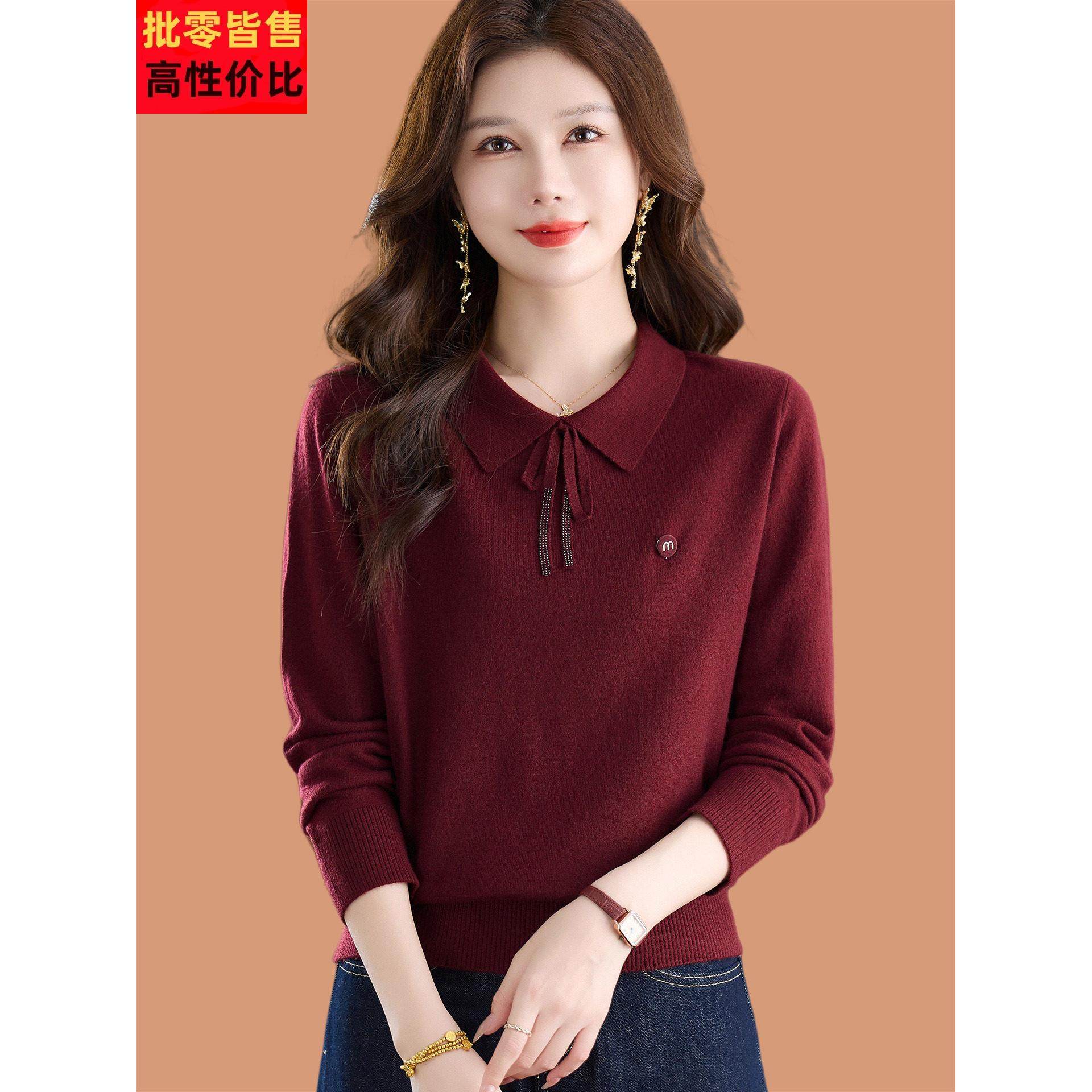翻领系带毛衣女春秋2025新款洋气质妈妈宽松薄款羊毛针织打底小衫